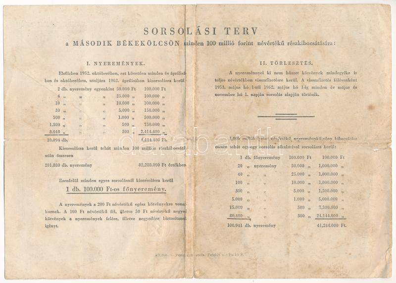 1951. "Második Békekölcsön" nyereménykölcsön 100Ft-ról szára... https://www.darabanth.com/de/440-Fernauktion/440.0/Numismatik/Aktien-und-Tickets~1500005/1951-Masodik-Bekekolcson-nyeremenykolcson-100Ft-rol-szarazpecsettel-lyukasztasokkal-C3~II2889308