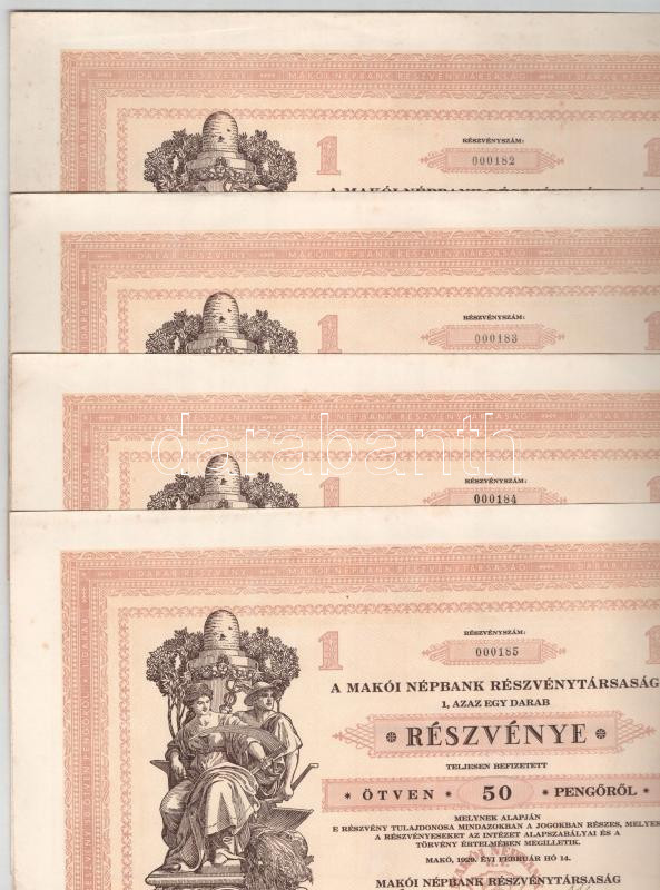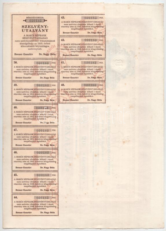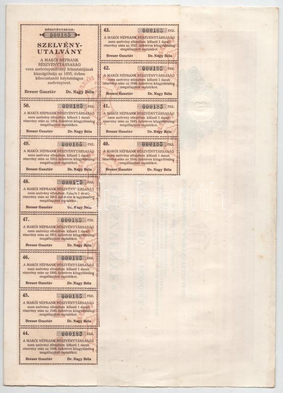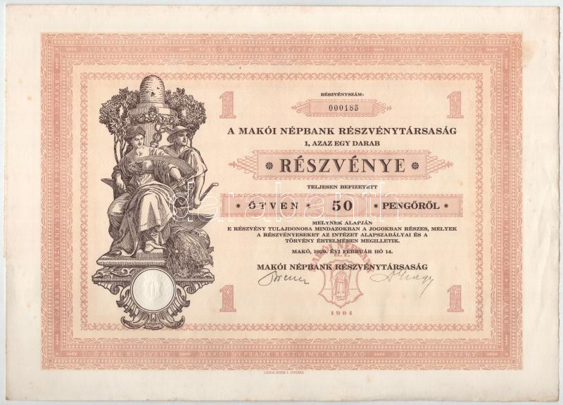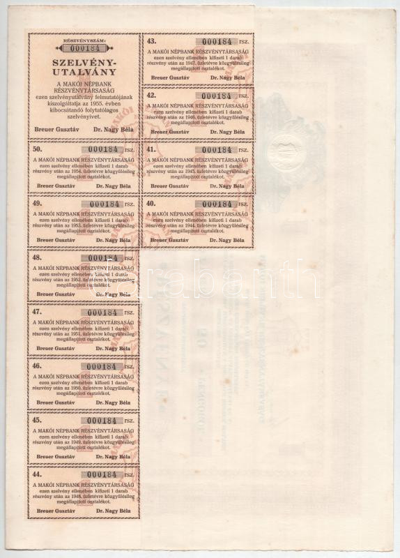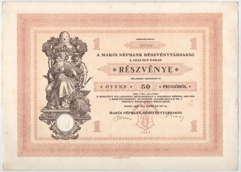 Makó 1929. "Makói Népbank Részvénytársaság" részvénye 50P-rő... https://www.darabanth.com/de/440-Fernauktion/440.0/Numismatik/Aktien-und-Tickets~1500005/Mako-1929-Makoi-Nepbank-Reszvenytarsasag-reszvenye-50P-rol-szelvenyekkel-szarazpecsC3~II2891329
