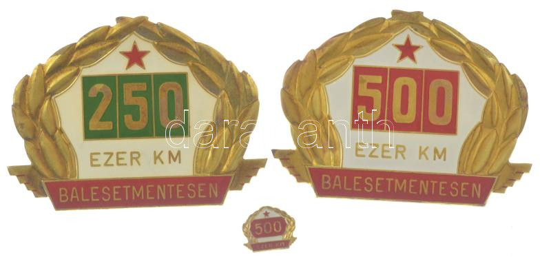 ~1980. "250 ezer km balesetmentesen" + "500 ezer km balesetmentesen" műgyantás kitüntető autójelvény (2x), utóbbi miniatűrrel (72x97mm), (17x20mm) T:XF