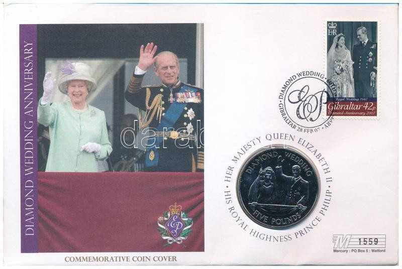 Jersey 2007. 5P "Gyémántlakodalom" Cu-Ni forgalomba nem került emlékkiadás felbélyegzett borítékban, első napi bélyegzéssel T:BU patina Jersey 2007. 5 Pounds "Diamond Wedding" Cu-Ni non-circulating commemorative coin in envelope with stamp, and first day cancellation T:BU patina Krause KM#178