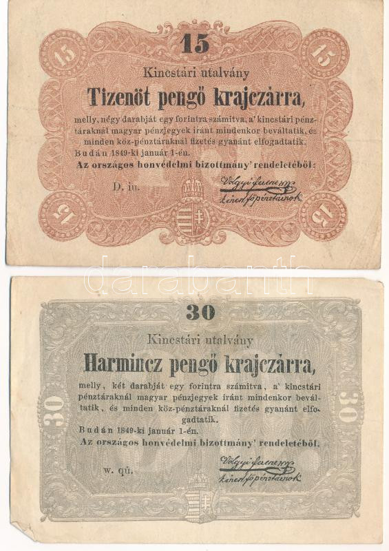 1849. 15kr + 30kr "Kossuth bankó" T:F folt, az egyik hátolda... https://www.darabanth.com/de/440-Fernauktion/440.0/Numismatik/Ungarische-Banknoten~1500007/1849-15kr-plus-30kr-Kossuth-banko-TF-folt-az-egyik-hatoldalan-kis-anyaghiany-Adamo-G102-G103~II2890357
