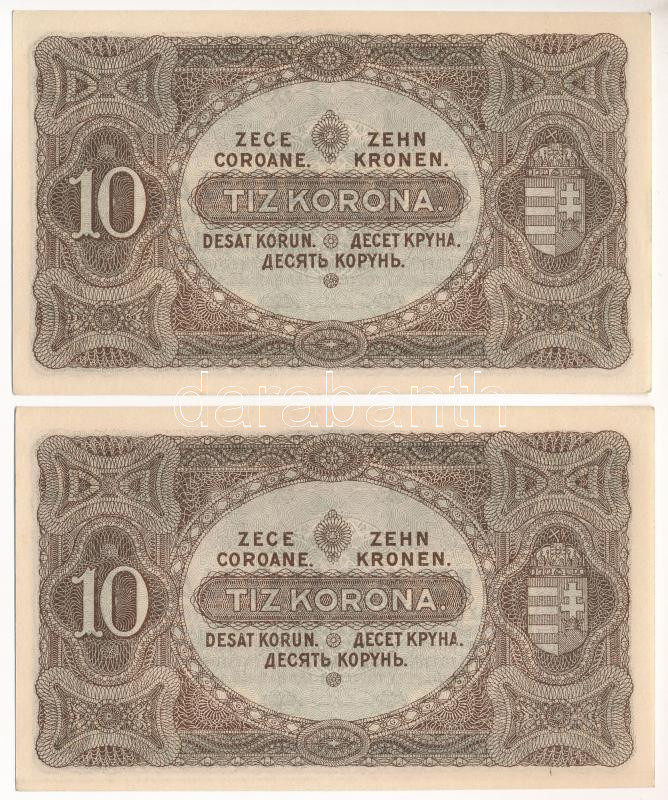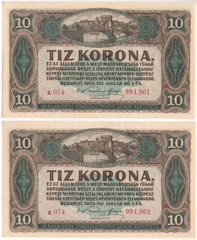 1920. 10K (2x) sorszámkövetők "a 074 994.961 - a 074 994.962"... https://www.darabanth.com/de/440-Fernauktion/440.0/Numismatik/Ungarische-Banknoten~1500007/1920-10K-2x-sorszamkovetok-a-074-994961-a-074-994962-TAU-kisse-hullamos-papir-Adamo~II2887092