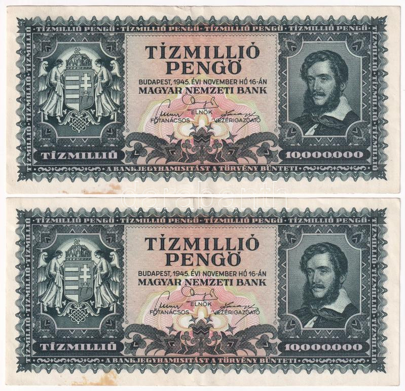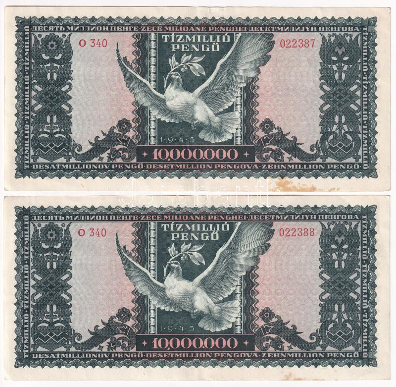 1945. 10.000.000P (2x) sorszámkövetők "O 340 022387 - O 340 02238... https://www.darabanth.com/de/440-Fernauktion/440.0/Numismatik/Ungarische-Banknoten~1500007/1945-10000000P-2x-sorszamkovetok-O-340-022387-O-340-022388-TF-folt-Adamo-P26~II2891902