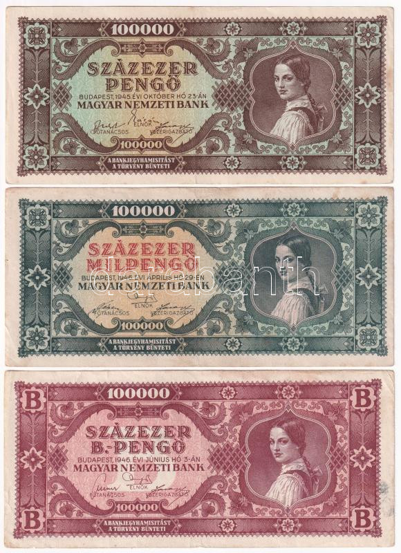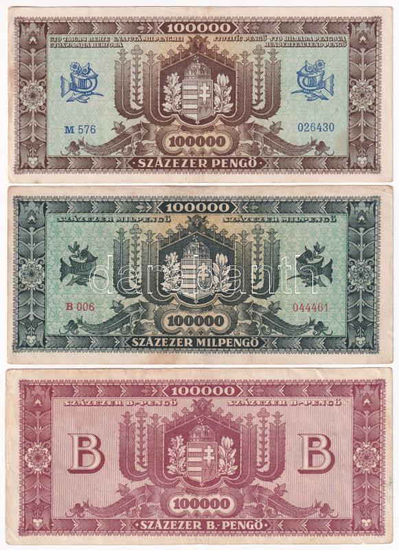 1945. 100.000P + 1946. 100.000MP + 100.000BP T:F folt, az egyiken apró... https://www.darabanth.com/de/440-Fernauktion/440.0/Numismatik/Ungarische-Banknoten~1500007/1945-100000P-plus-1946-100000MP-plus-100000BP-TF-folt-az-egyiken-apro-szakadas~II2892086