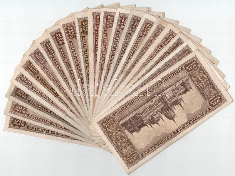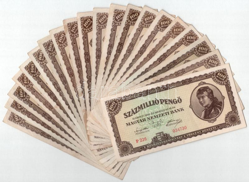 1946. 100.000.000P (20x) T:F Adamo P27 https://www.darabanth.com/de/440-Fernauktion/440.0/Numismatik/Ungarische-Banknoten~1500007/1946-100000000P-20x-TF-Adamo-P27~II2888091