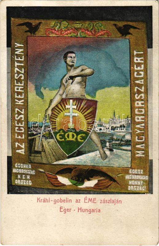 Az egész keresztény Magyarországért. Csonka Magyarország nem ország, egész Magyarország mennyország. Kráhl-gobelin az ÉME zászlaján Eger-Hungaria / Hungarian irredenta flag, propaganda
