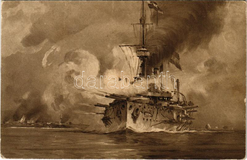 Beschreibung: 1917 SM Kriegsmarine im Weltkriege. SMS Zrínyi beschiesst Sinigalia am 24. Mai 1915 / SMS Zrínyi Osztrák-Magyar Haditengerészet Radetzky-osztályú pre-dreadnought csatahajó / WWI Austro-Hungarian Navy, K.u.K. Kriegsmarine, SMS Zrínyi pre-dreadnought battleship. Verlag F. W. Schrinner, Pola s: Ramberg (EK)