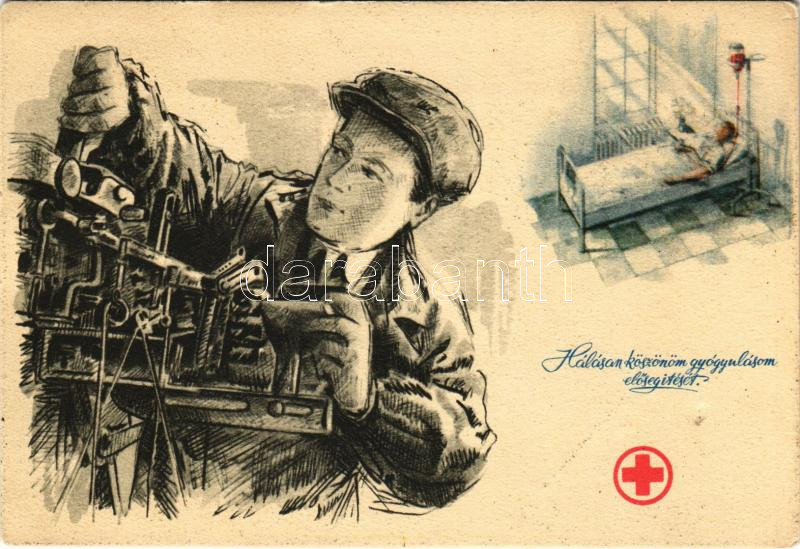Beschreibung: Hálásan köszönöm a gyógyulásom elősegítését. Magyar Vöröskereszt Budapesti Szervezete. Képzőművészeti Alap / Hungarian Red Cross propaganda (EK)