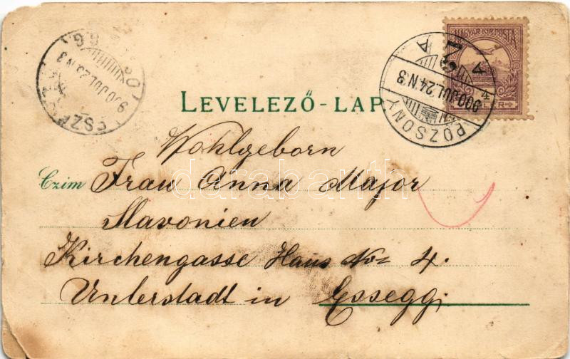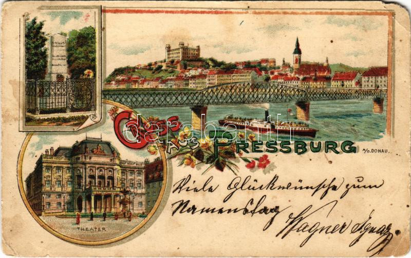 1900 Pozsony, Pressburg, Bratislava; emlékmű, híd, vár, színház / monument, castle, bridge, theatre. Art Nouveau, floral, litho (EM)