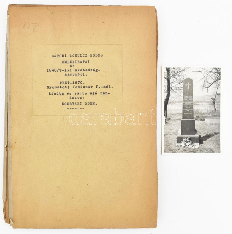 Egervári Ödön: Bátori Schulcz Bódog emlékiratai 1848/49-iki szabadságharczból. Kiadta és sajtó alá rendezte - - 1848/49-ki honvéd-huszár hadnagy. Pest, 1870, Vodiáner E., 1 t. +4+127 p.+ 4 ( térkép és csata vázlatok, közte 2 kihajtható) t. Második kiadás. Átkötöt amatőr papírkötés, a könyvtest szétvált a 4-5. oldalak között. Benne "Bátori Schulcz Bódog" sírjáról készült kis fotóval.