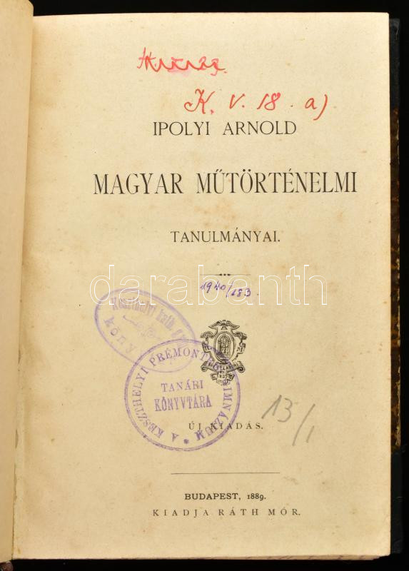 Ipolyi Arnold: Magyar műtörténelmi tanulmányai. Bp., 1889., Ráth Mór, 4+576+1 p. Átkötött egészbőr-kötés, a gerinc modern pótlás, kissé foltos lapokkal, intézményi bélyegzővel.