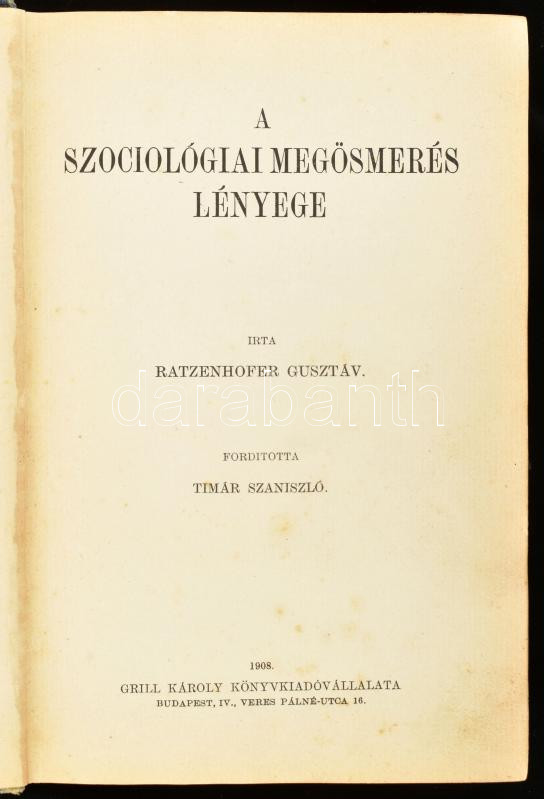 Ratzenhofer Gusztáv: A szociológiai megösmerés lényege. Bp., 1908. Gri... https://www.darabanth.com/de/441-Fernauktion/441.0/Bucher/Bucher-Sozialwissenschaften~500043/Ratzenhofer-Gusztav-A-szociologiai-megosmeres-lenyege-Bp-1908-Grill-kiadoi-vaszonkote~II2904585