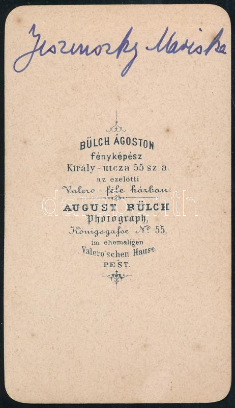 Beschreibung: cca 1870 Jeszenszky Mariska feliratozott vizitkártya Pest August Büch műterme