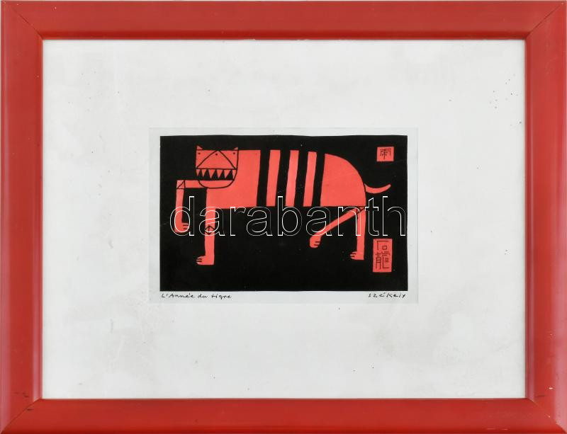 Beschreibung: Pierre Székely (1923-2001): A tigris éve (L'Année du tigre). Litográfia, papír, jelzett. Üvegezett fakeretben. 10×15 cm