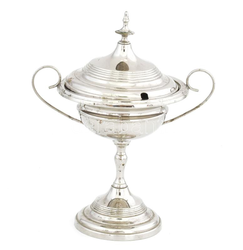 Beschreibung: Talpas kaviár kínáló, fedéllel, ezüstözött, jelzés nélkül, kopásokkal, m: 27 cm