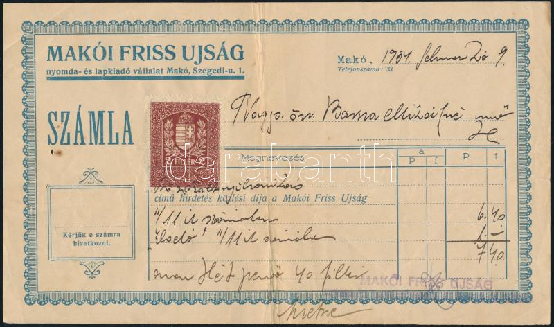 1934 Makó, Makói Friss Újság által kiállított számla, illetékbélyeggel https://www.darabanth.com/de/441-Fernauktion/441.0/Kunst-Dokumente-andere-Sammelgebiete/Dokument~500022/1934-Mako-Makoi-Friss-Ujsag-altal-kiallitott-szamla-illetekbelyeggel~II2904953