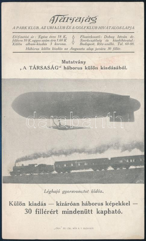 1914 A Társaság újság "Léghajó gyorsvonatot üldöz" (Zeppelin) című kép... https://www.darabanth.com/de/441-Fernauktion/441.0/Kunst-Dokumente-andere-Sammelgebiete/Drucksachen~500055/1914-A-Tarsasag-ujsag-Leghajo-gyorsvonatot-uldoz-Zeppelin-cimu-keppel-diszitett-rek~II2904483