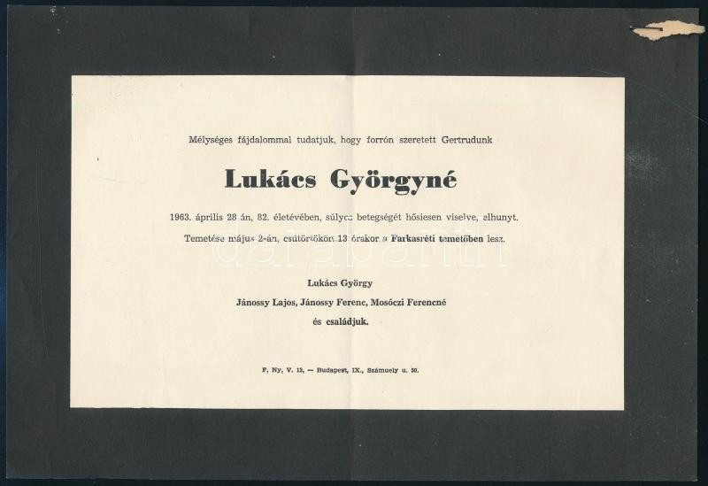 1963 Lukács Györgyné Bortstieber Gertrúd halálozási értesítője https://www.darabanth.com/de/441-Fernauktion/441.0/Kunst-Dokumente-andere-Sammelgebiete/Drucksachen~500055/1963-Lukacs-Gyorgyne-Bortstieber-Gertrud-halalozasi-ertesitoje~II2897889