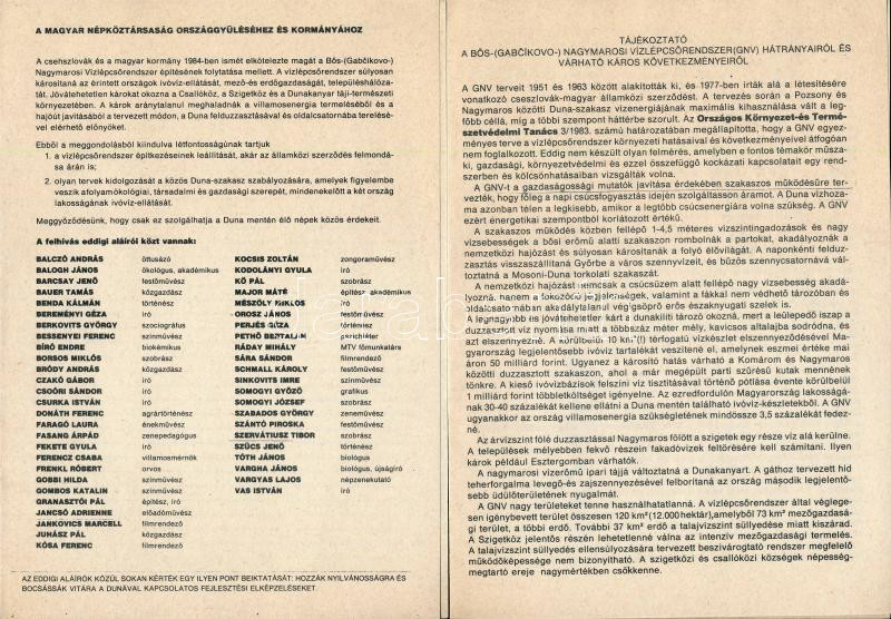 1984 A tervezett Bős-Nagymaros vízlépcső hátrányairól és várható káros következményeiről szóló tájékoztató, az országgyűléshez és a kormányhoz szóló felhívással, rajta ismert közéleti személyiségek neveivel, közte Balczó András, Barcsay Jenő, Bessenyei Ferenc, Csoóri Sándor, Gobbi Hilda, Sinkovits Imre és mások. Kitöltetlen aláírói résszel.