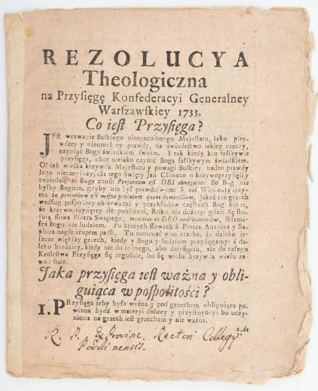 cca 1733 Rezoluczya Theologiczna na Przysiege Konfederacyi Generalney Warszawskiey 1733. Co iest Przysiega? Lengyel és latin nyelven, foltos, kis lapszéli szakadásokkal, 4 sztl.