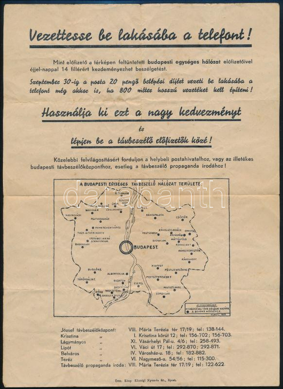cca 1940 Vezettesse be e a telefont Budapesti Egységes Távbeszélő háló... https://www.darabanth.com/de/441-Fernauktion/441.0/Kunst-Dokumente-andere-Sammelgebiete/Drucksachen~500055/cca-1940-Vezettesse-be-e-a-telefont-Budapesti-Egyseges-Tavbeszelo-halozat-nagy-nyomtatvany~II2876737