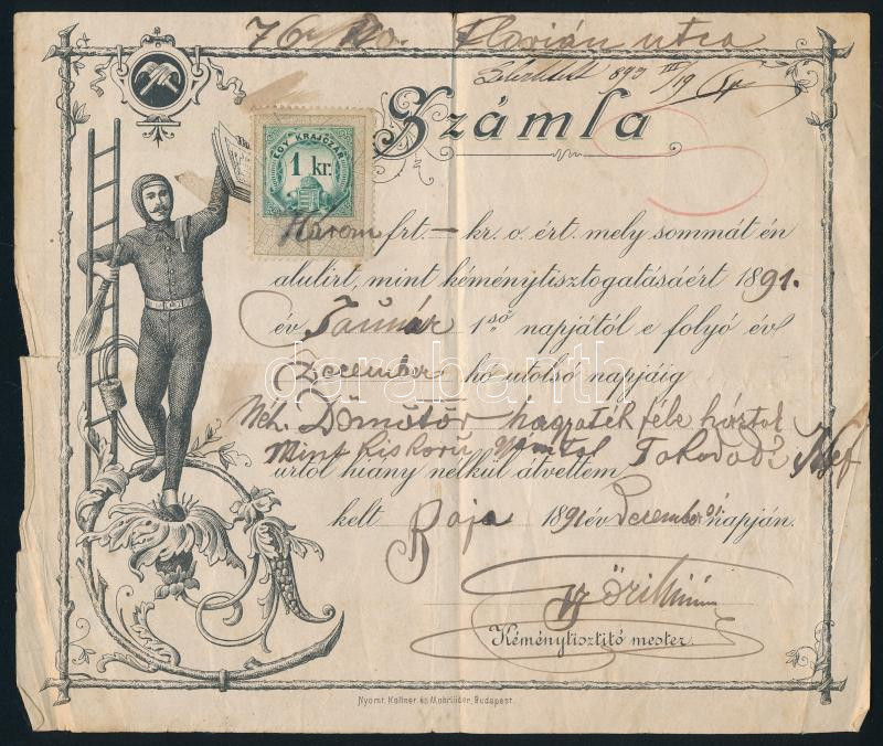1891 Baja, dekoratív kéményseprő számla, 1 kr okmánybélyeggel, lap szé... https://www.darabanth.com/de/441-Fernauktion/441.0/Kunst-Dokumente-andere-Sammelgebiete/Historische-Dokumenten-Handschriften~500023/1891-Baja-dekorativ-kemenysepro-szamla-1-kr-okmanybelyeggel-lap-szele-kisse-serult-19~II2900302