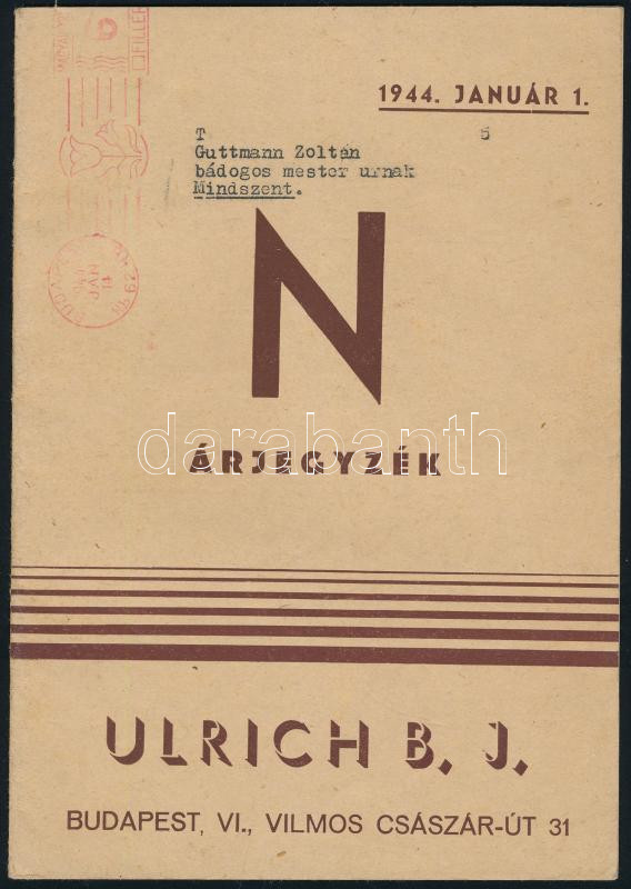 1944 Ulrich B. J. "N" árjegyzék, 1944. január 1. (gáz- és vízvezetékek... https://www.darabanth.com/de/441-Fernauktion/441.0/Kunst-Dokumente-andere-Sammelgebiete/Werbungen~500026/1944-Ulrich-B-J-N-arjegyzek-1944-januar-1-gaz-es-vizvezetekek-csovek-furdoszoba~II2900091