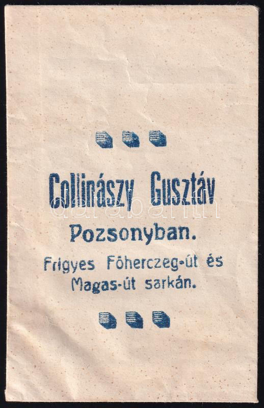 cca 1890 Collinászy Gusztáv pozsonyi vegyeskereskedésének papírtasakja https://www.darabanth.com/de/441-Fernauktion/441.0/Kunst-Dokumente-andere-Sammelgebiete/Werbungen~500026/cca-1890-Collinaszy-Gusztav-pozsonyi-vegyeskereskedesenek-papirtasakja~II2898270