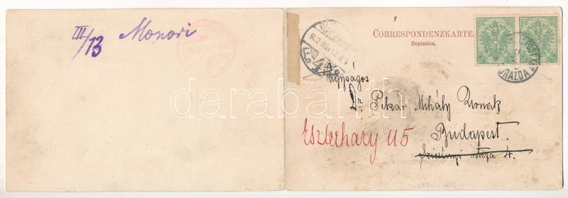 Beschreibung: 1902 Gorazde, Gorazda; Hermann Wasserstein 2-tiled folding panoramacard + "K.u.k. Milit. Post XXII. Gorazda" (fl)