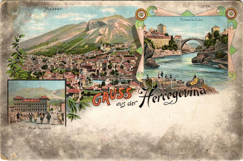 Mostar, Römerbrücke, Hotel Narenta. Gruss aus der Hercegovina. Art Nou... https://www.darabanth.com/de/442-Fernauktion/442.0/Ansichtskarten/Bosnien-und-Herzegowina~2000024/Mostar-Romerbrucke-Hotel-Narenta-Gruss-aus-der-Hercegovina-Art-Nouveau-floral-litho-non-PC~II2910805