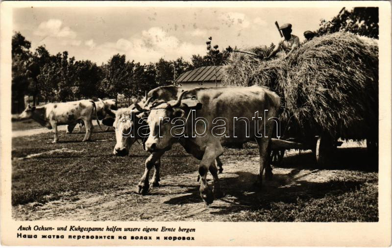 1943 Auch Ochsen- und Kuhgespanne helfen unsere eigene Ernte bergen / Ukrán folklór, ökör és tehát szekér szüretkor / Ukrainian folklore, oxen and cow carts helping during harvest + "Magyar Királyi Tábori Posta "