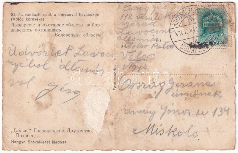 1941 Volóc, Volovec, Volovets; Sí- és vadászterepek a Borzsovai-havaso... https://www.darabanth.com/de/442-Fernauktion/442.0/Ansichtskarten/Karpatenukraine~2000009/1941-Voloc-Volovec-Volovets-Si-es-vadaszterepek-a-Borzsovai-havasokon-sielo-szarvassal-t~II2909200