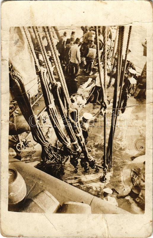 Beschreibung: K.u.K. Kriegsmarine SMS Viribus Unitis Osztrák-Magyar Haditengerészet Tegetthoff-osztályú dreadnought csatahajó, török katonák kiszállása / WWI Austro-Hungarian Navy, Turkish soldiers leaving SMS Viribus Unitis. photo (szakadások / tears)