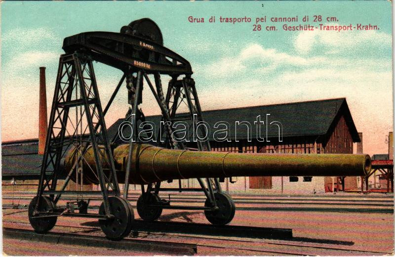 Pola, Pula; Grua di transporto pei cannoni di 28 cm / 28 cm Geschütz Transport Krahn (F. Krupp), K.u.k. Kriegsmarine / Osztrák-magyar haditengerészeti ágyú szállító daru egy 28 cm-es löveggel / Austro-Hungarian Navy artillery transport crane. G. Fano, Pola 1909. No. 57.