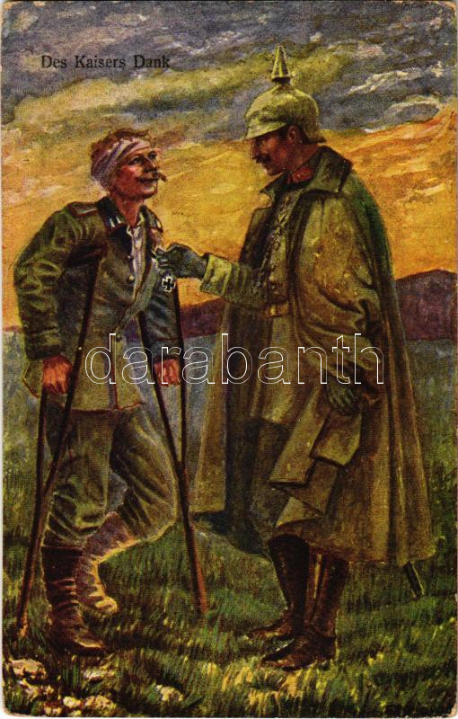 1916 Das Kaisers Dank / WWI German military art postcard with Emperor Wilhelm II and injured soldier + "K.u.K. Infanterieregiment Hoch- und Deutschmeister Nr. 4. 3. Feldkompagnie" (EK)