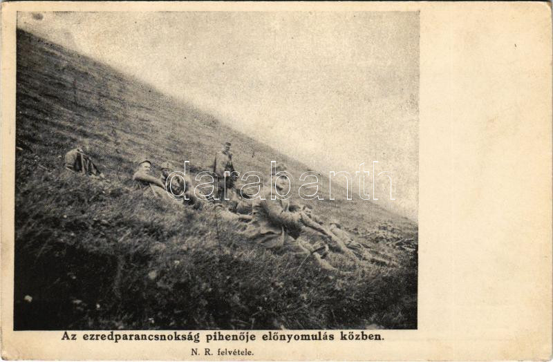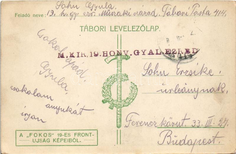Az ezredparancsnokság pihenője előnyomulás közben. N. R. felvétele. Tábori levelezőlap a "Fokos" 19-es frontújság képeiből + "M. kir. 19. honv. gyal. ezred"