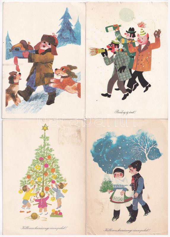 12 db MODERN magyar retro grafikai üdvözlő képeslap vegyes minőségben. Képzőművészeti Alap / 12 modern Hungarian retro graphic postcards in mixed quality: greetings
