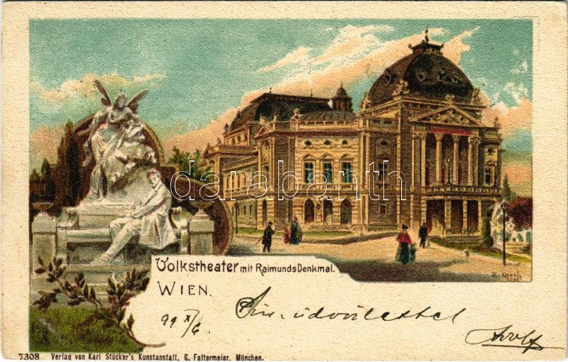 Beschreibung: 1899 (Vorläufer) Wien, Vienna, Bécs; Volkstheater mit Raimunds Denkmal / theatre, monument. Karl Stücker's Kunstanstalt 7308. Art Nouveau, litho (EK)