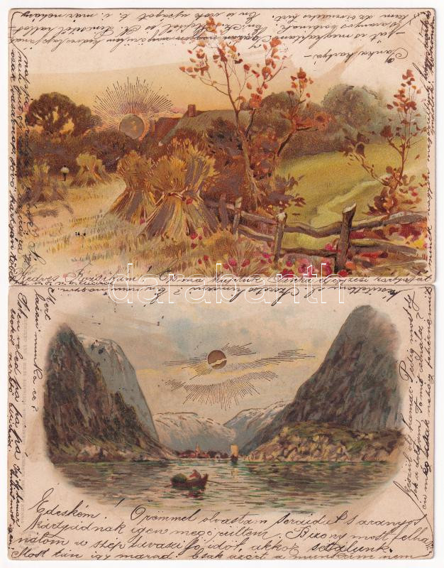 Beschreibung: 2 db RÉGI litho képeslap aranyozott nap díszítéssel / 2 pre-1900 litho postcards with golden sun decoration