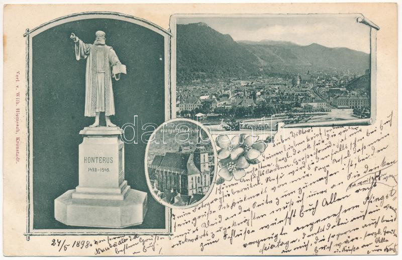 Beschreibung: 1898 (Vorläufer) Brassó, Kronstadt, Brasov; Evangélikus templom, Honterus szobor. Wilh. Hiemesch / statue, Lutheran church. Art Nouveau, floral