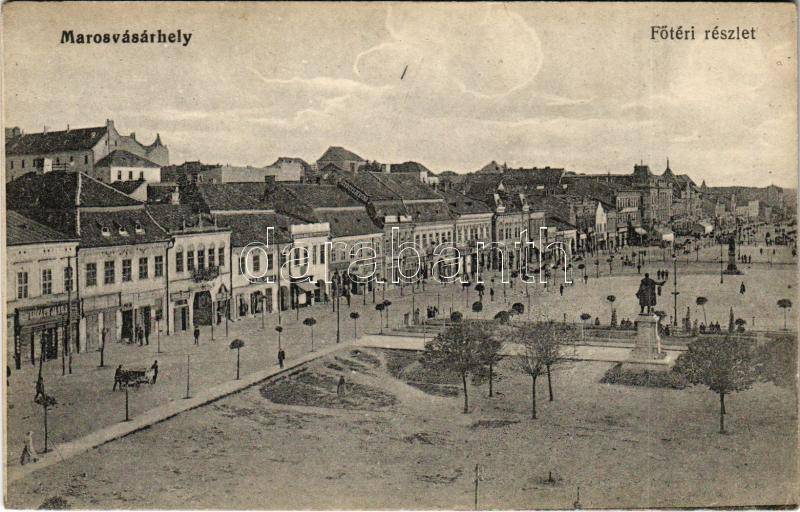 Marosvásárhely, Targu Mures; Fő tér, Kossuth szobor, Lang Béla, Lukács János üzlete, gyógyszertár. Porjes S. Sándor kiadása / main square, statue, shops, pharmacy (EK)