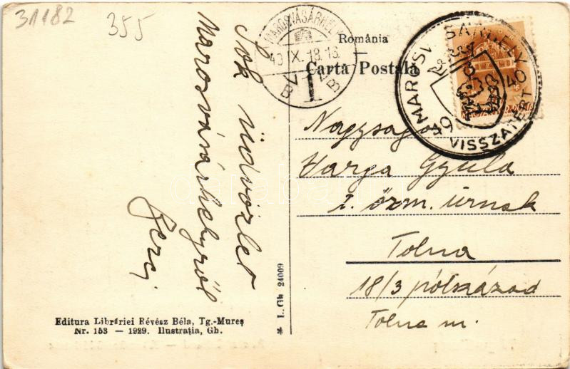 Beschreibung: Marosvásárhely, Targu Mures; Palatul Cultural / Közművelődési ház / palace of culture, community center + "1940 Marosvásárhely visszatért" So. Stpl. (EK)