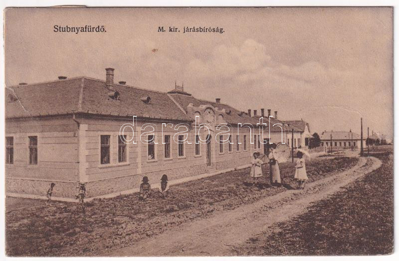 Beschreibung: 1920 Stubnyafürdő, Túróchévíz, Stubnianske Teplice, Turcianske Teplice; M. kir. járásbíróság. Stransky Jakab és veje kiadása / county court (fa)