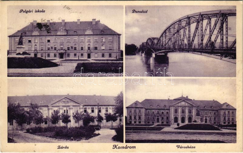 1934 Komárom, Komárno; Polgári iskola, Duna híd, zárda, Városháza / sc... https://www.darabanth.com/de/442-Fernauktion/442.0/Ansichtskarten/Slowakei~2000008/1934-Komarom-Komarno-Polgari-iskola-Duna-hid-zarda-Varoshaza-school-bridge-nunnery-~II2870865