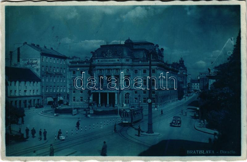 Beschreibung: 1937 Pozsony, Pressburg, Bratislava; Divadlo, Zbrane Waffen Seifert, Domov a Slovákia / színház, villamos, autó / theatre, tram, autmobiles
