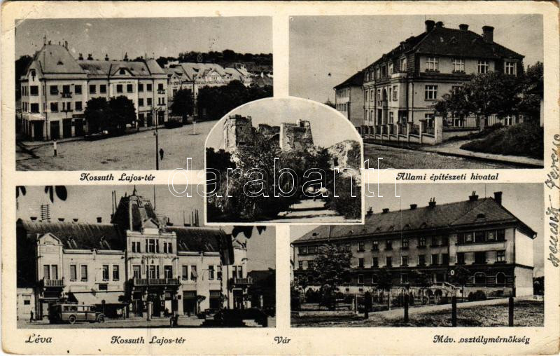 1940 Léva, Levice; Kossuth Lajos tér, Állami építészeti hivatal, autóbusz, vár, MÁV osztálymérnökség / square, castle, state architectural office, autobus (Rb)