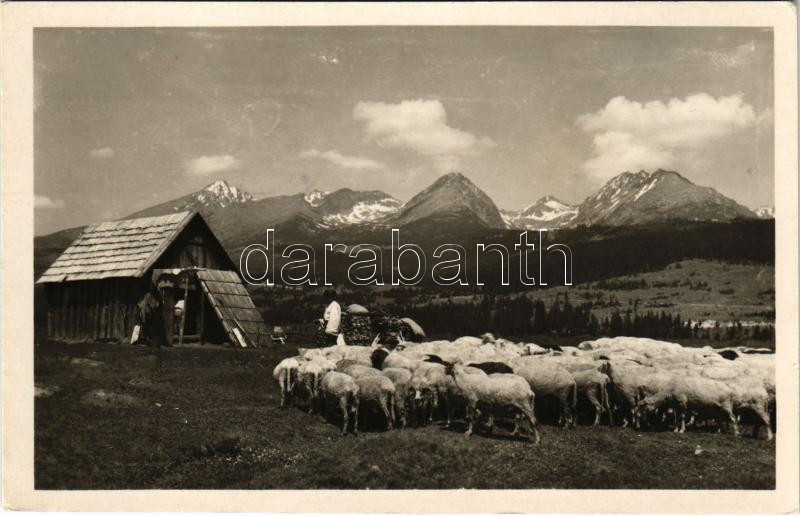 Beschreibung: 1948 Tátra, Magas-Tátra, Vysoké Tatry; Pod Strbskym stítom, Kriván, Solisko, Patria / birkanyáj, hegyek / flock of sheep, mountains (Rb)