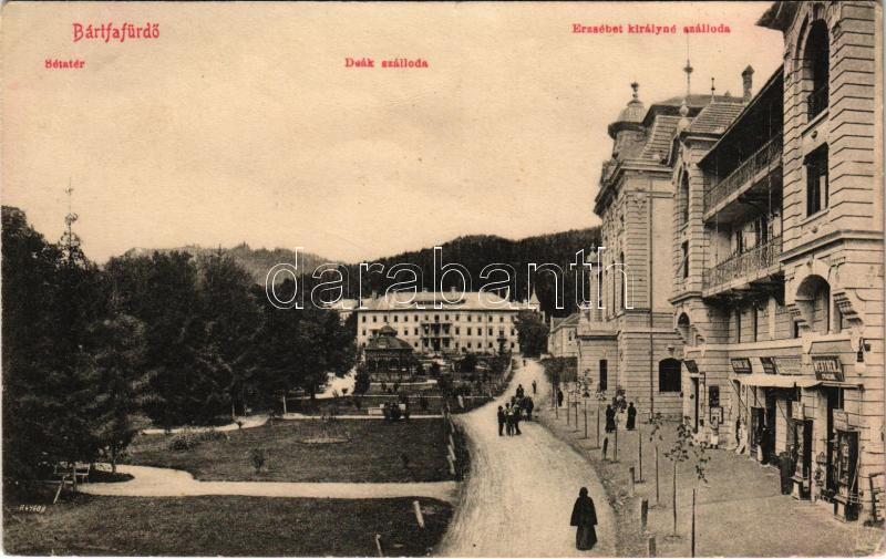 Bártfafürdő, Bardejovské Kúpele, Bardiov, Bardejov; Sétatér, Deák szálloda, Erzsébet királyné szálloda, Reichard Emil, Werther J. üzlete. Eschwig és Hajts kiadása. Hajts Kornél felvétele / spa, hotels, shops (EB)
