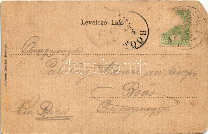 Beschreibung: Pozsony, Pressburg, Bratislava; vár, gőzhajó. Címeres szecessziós keret, Holderer Gusztáv kiadása / castle, steamship. Art Nouveau, coat of arms, litho (b)