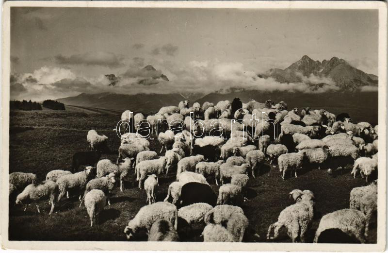 Beschreibung: Tátra, Magas-Tátra, Vysoké Tatry; Pohlad od Dolného Smokovca / kilátás Alsótátrafüred felé, birkanyáj / general view, flock of sheep